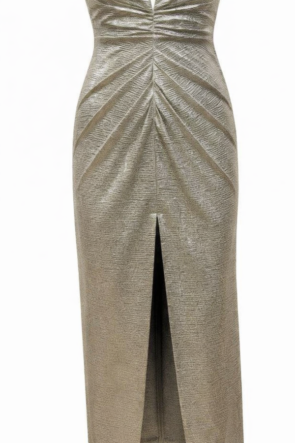 The GOLDEN HOUR OBSESSION GOWN is that effortless glow you don’t have to think twice about. The moment you put it on, everything just… clicks. Designed with a sculpted strapless neckline and a sleek, body-contouring silhouette, this ankle-length gown hugs you in all the right places while keeping a clean, elevated finish. The soft metallic sheen catches every light, while the front slit adds just enough edge to keep it unforgettable. Finished with a lace-up back for a custom, snatched fit, it’s breathable, smooth, and made to move with you all night.