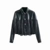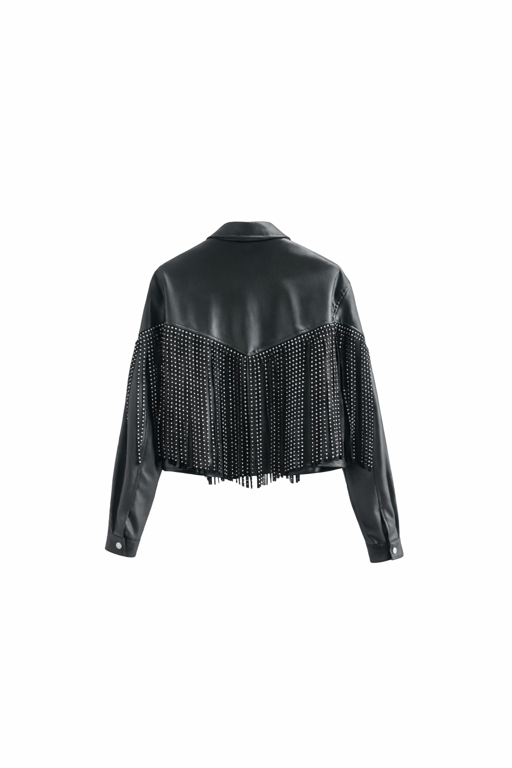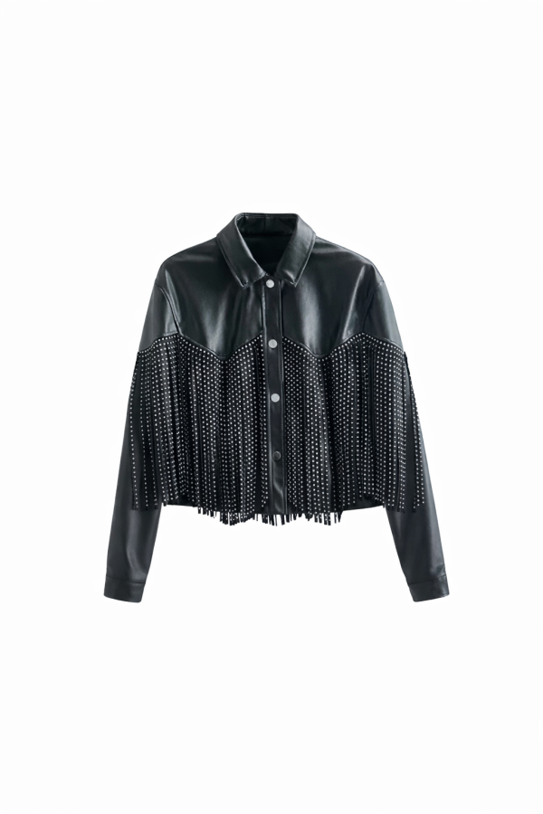 The Runway Rebel Fringe Jacket is crafted from sleek coated denim with a smooth leather-like finish, giving you that bold moto look with comfortable structure. Designed with a classic collar, front snap buttons, long sleeves, and dramatic studded fringe detailing, every movement creates head-turning energy.