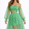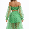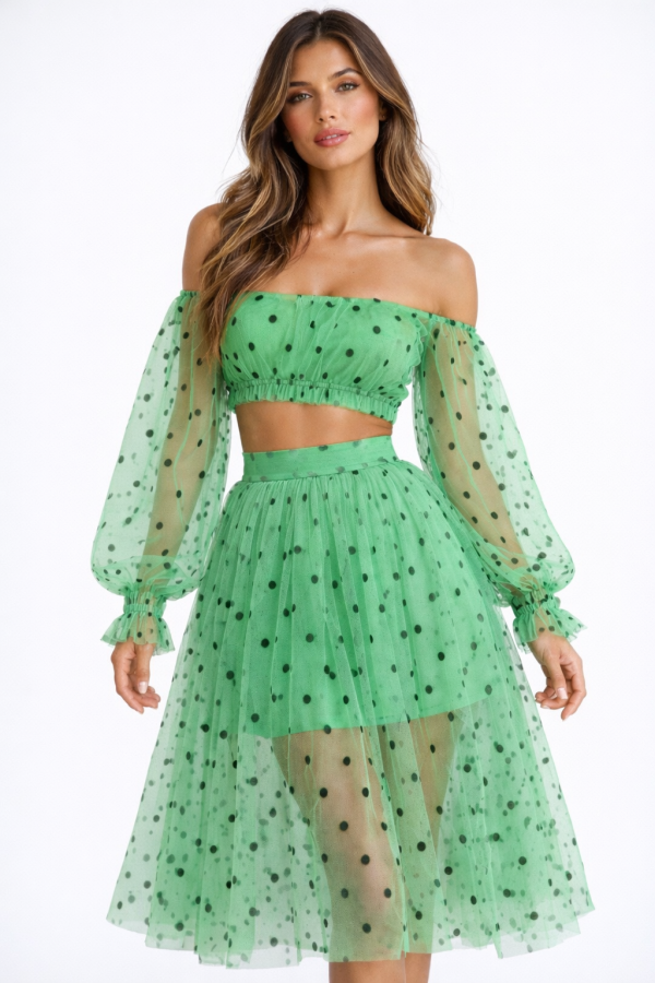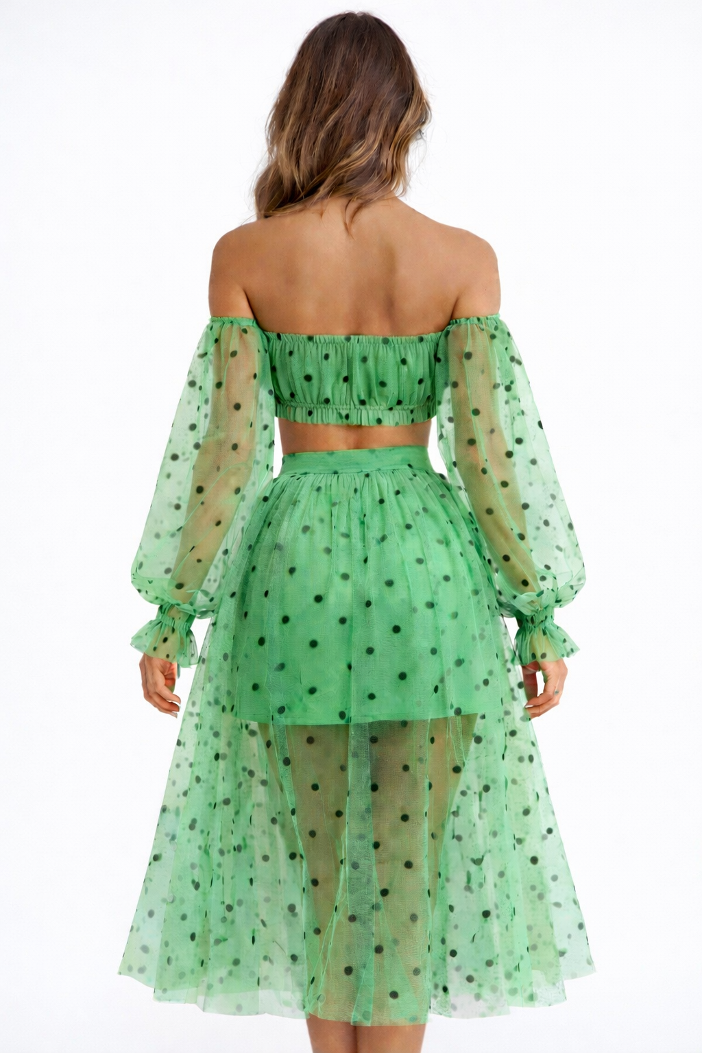 The Lucky You Set is playful confidence wrapped in sheer polka-dot mesh. Featuring a flirty off-shoulder top and a high-waisted skirt that moves effortlessly with you, this set was made for the woman who knows she’s the moment the second she walks in.