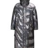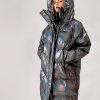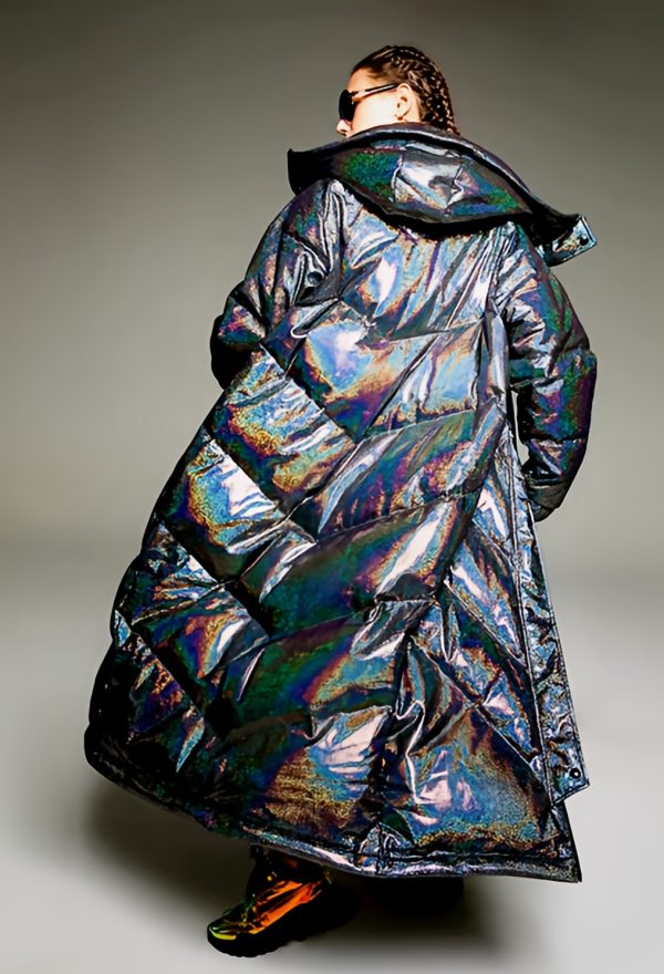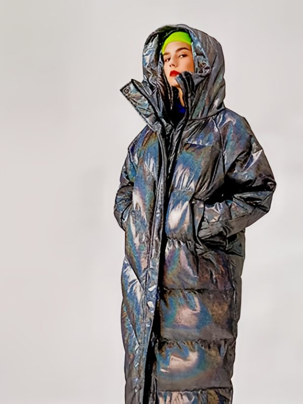 The thick, full-length design and hooded collar wrap you in high-end comfort, while the iridescent sheen catches light — and attention — with every move. A two-way zipper adds flexibility and attitude, letting you adjust your look from street-chic to high-glam in seconds.